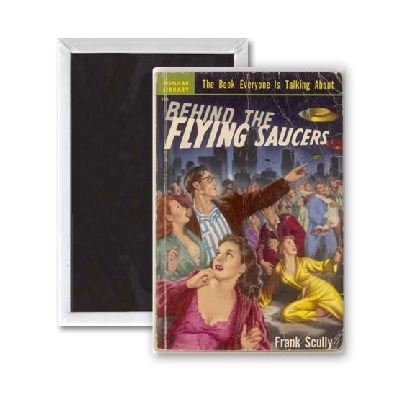 Art247 - 'Behind the Flying Saucers, book cover' - Aimant de réfrigérateur, 7,5 x 5 cm - gros bouton aimanté - aimant